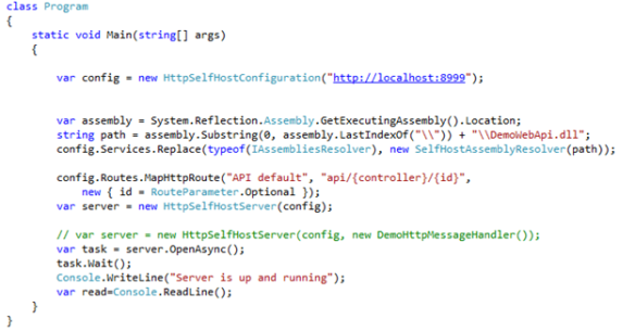 In the above code snippet, DemoWebApi.dll is the main Web API project I was using initially, that had used the default Web API hosting on IIS.