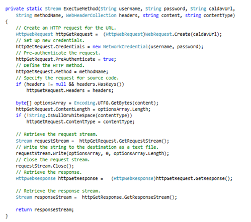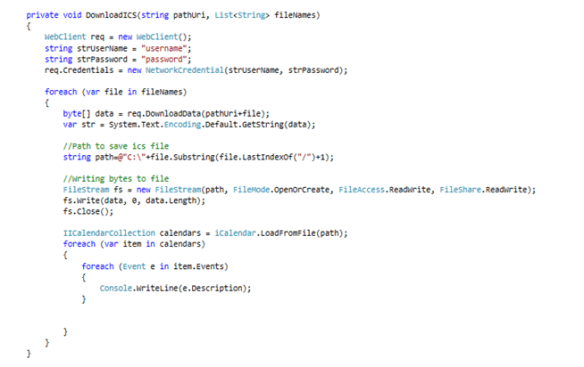 ExecuteMethod is a helper method that sends request to the server and returns the response stream. Once I get the response stream I load the XML document and read the InnerXml of the file to get the complete XML. Then I parse the xml document and search for DAV:href element that contains the calendar event file (.ics) information. Once I get the list of .ics file paths, I call DownloadICS helper method to get the complete event information.