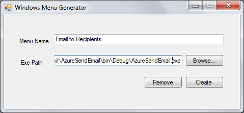 Above screen show two text field controls named Menu Name and Exe Path. In the “Menu Name” text field we just specify the menu we want to create in the windows registry where as the “Exe Path” holds the executable (in our case a console application) that launches when user click on that menu.